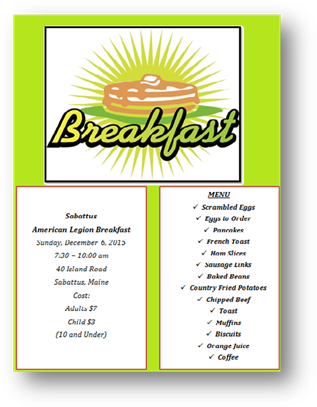 Legion Breakfast Cost: Adults $7 Children $3 (10 and Under) Kitchen Volunteers please arrive by 6:00 am Wait Volunteers please arrive by 6:30 am FMI: Joan Caron |