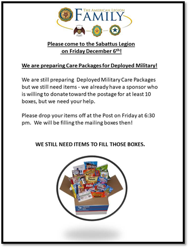 Sabattus Legion Care Packages for Deployed Soldiers FMI: Denise Michaud And Joan Caron |