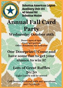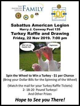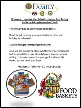 be eligible for the drawing! More tickets will be sold at the Sabattus Credit Union! Bring Dollar Bills to the Post We Spin the Wheel! Additional Chances to win 10-12 lb Turkeys! Also deadline for bringing in Items for the Thanksgiving Baskets! FMI: