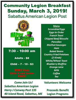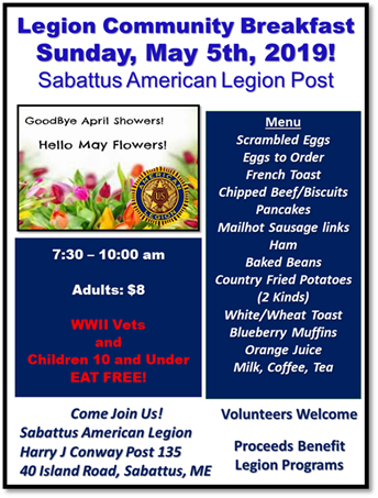 Sabattus Legion Hall Community Members Welcome! Volunteers Welcome! Awards for Breakfast Volunteers! All you can eat buffet! |