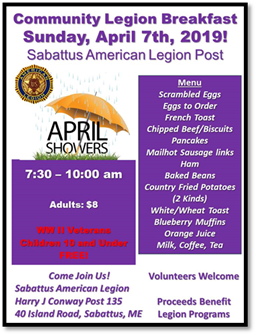 Sabattus Legion Community Breakfast Cost: Adults $8 Children $3 (10 and Under) Kitchen Volunteers please arrive by 6:00 am Wait Volunteers please arrive by 6:30 am FMI: Joseph